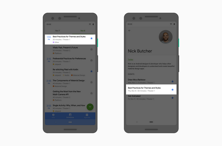 Google I/O app에서 컨퍼런스 세션 리스트를 두 화면에서 보여주는 예제입니다.